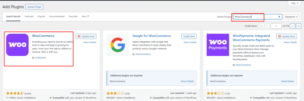 Go to Plugins > Add New, search for “WooCommerce”, and click Install Now.