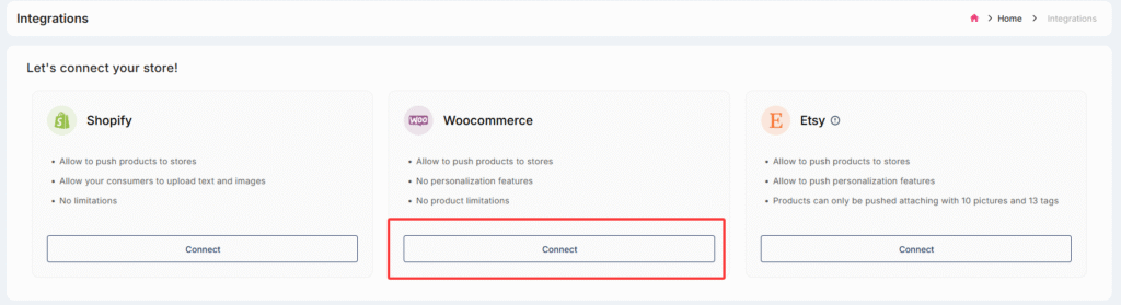 Once integrated, your WooCommerce store will appear on the JetPrint connection page.